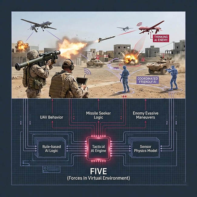 FIVE (Forces In Virtual Environment) 戰術環境模擬與軍事訓練系統是核心軟體首選,支援從地面車輛到空中載具的完整 AI 行為定義與感測器模擬。