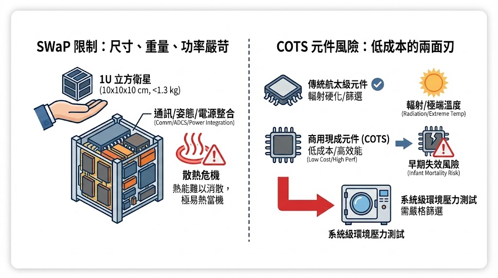 為了在極小的空間內塞入通訊酬載、姿態控制與電源系統,模組的整合密度極高,這導致熱能難以消散,在缺乏空氣對流的真空中,電子元件產生的廢熱只能透過傳導散除,極易引發熱當機。 - 商用現成元件(COTS)的兩面刃: