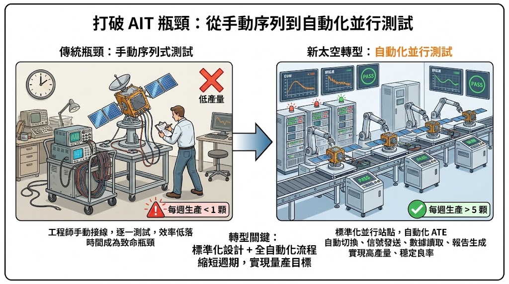 在巨型星座的商業模式中,時間就是金錢,如果一家公司每週需要生產並發射五顆衛星,傳統那種「工程師推著儀器車、手動接線、逐一紀錄數據」的序列式測試流程將成為致命的瓶頸。