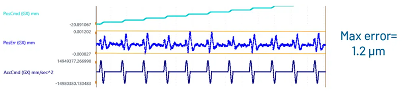 圖 4. 上圖顯示了來自 Automation1 在 200kHz 下的資料視覺化結果,其中一個掃描器軸向的位置誤差始終未離開所定義的 +/- 1.5 微米穩定區間。