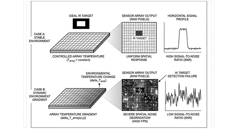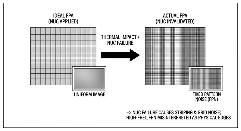 微測輻射熱計陣列中的數十萬個像素,其熱響應增益與偏移量皆存在微觀的半導體製程公差,在無人機實際服役的動態環境中,機載光學艙的物理溫度可能在數分鐘內產生數十度的劇烈變化,這種熱衝擊會導致焦平面陣列 (FPA) 的底層基板產生無法預測的熱梯度與熱遲滯現象,原本在實驗室常溫下建立的兩點非均勻性校正 (NUC) 補償係數會瞬間失效,導致影像呈現嚴重的網格狀或條紋狀「固定模式雜訊 (Fixed Pattern Noise, FPN)」,對於依賴像素對比度邊緣來進行特徵提取的 AI 系統而言,高頻的 FPN 會被誤認為實體邊緣,徹底摧毀演算法的辨識率。