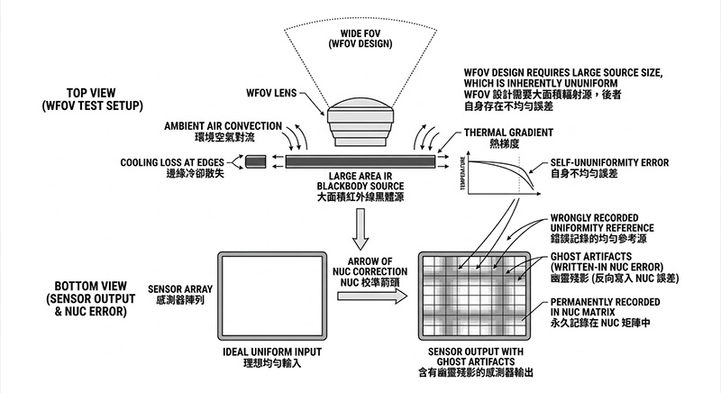 為了解決陣列的空間響應不一致,測試系統必須在泛光模式 (Flood Mode) 下,向感測器提供一個充滿整個視場角 (FOV) 且溫度絕對均勻的紅外線輻射參考源,工程實務上的物理矛盾在於:無人機夜視鏡頭多採用廣視場角 (WFOV) 設計,這要求測試輻射源必須具備大面積的物理尺寸;然而,大面積金屬輻射板在邊緣極易受到環境空氣對流的影響而產生熱散失,若輻射參考源自身存在哪怕僅有百分之五攝氏度的空間熱梯度,這個「設備自身的不均勻誤差」就會被感測器忠實地記錄下來,並反向寫入 NUC 補償矩陣中。這意味著錯誤的校準基準會將幽靈殘影永久烙印在無人機的視覺中。