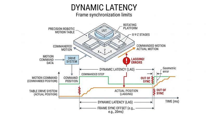在高速交戰或高機動無人機模擬中,場景的更新必須與 UUT 的姿態變化完美同步,現代 IRSP 系統的輻射升降時間 (Rise/fall time) 必須嚴格控制在 5 毫秒以內,若投影陣列的熱慣性過大或電子處理存在延遲,UUT 將會觀測到嚴重的熱拖影 (Thermal smearing) 或空間-時間採樣偽影 (Spatial-temporal sampling artifacts),這種微秒級的延遲誤差,在閉迴圈系統中會被放大,導致尋標器演算法產生錯誤的導航修正指令,使得測試數據失效。