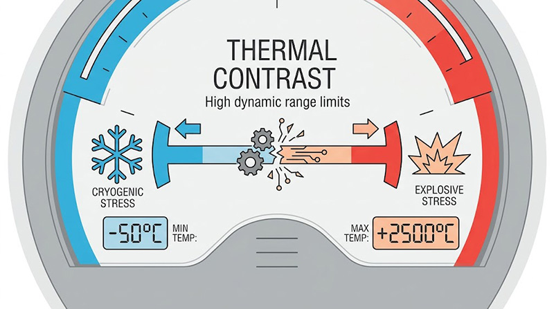 真實戰場的 LWIR 場景通常包含低溫的深空/地表背景 (約 250K-300K) 以及極高溫的動態目標 (如引擎尾焰或爆炸,上看 1500K 以上),在實驗室中,要單一投影陣列同時精準模擬微小溫差的冷背景與極高溫度的突發熱源,會對 IRSP 的驅動位元深度 (Bit depth) 造成極大挑戰,若系統無法在廣闊的動態範圍內維持微克耳文 (mK) 級的熱解析度,UUT 的自動增益控制 (AGC) 與非均勻性補償演算法將無法在實驗室中得到正確的激發與驗證。