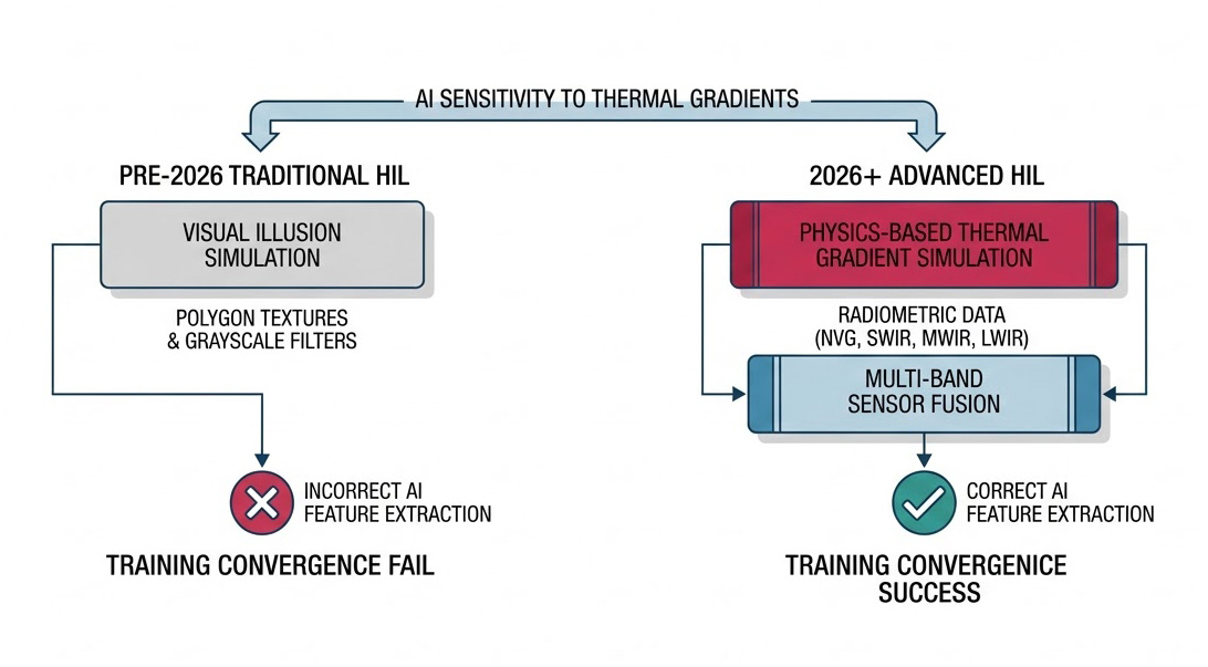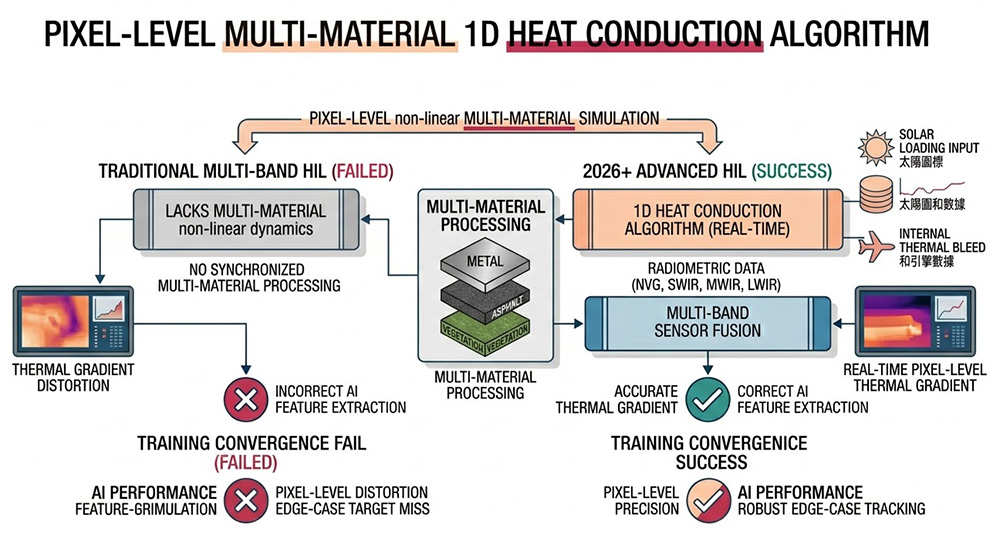 邁入 2026 年新一代無人載具(UAV)在數位戰場的偵蒐與打擊任務,已全面依賴基於人工智慧(AI)的熱成像影像融合演算法,各項先進軍工標準與航空電子測試規範(如最新修訂之 MIL-STD 與 DO-178C)已強制要求,無人機搭載的夜視鏡(NVG)及短波/中波/長波紅外線(SWIR/MWIR/LWIR)感測器,在實體部署前必須於實驗室內通過極度嚴苛的硬體在環(Hardware-in-the-Loop, HIL)模擬驗證,這類測試之所以變得空前嚴格,主因在於 AI 演算法對「熱梯度(Thermal Gradients)」的敏感度極高;傳統基於多邊形紋理與灰階濾鏡的「視覺假象」模擬,完全無法提供具有物理意義的熱輻射數據,會導致 AI 在訓練收斂時擷取到錯誤的特徵值。