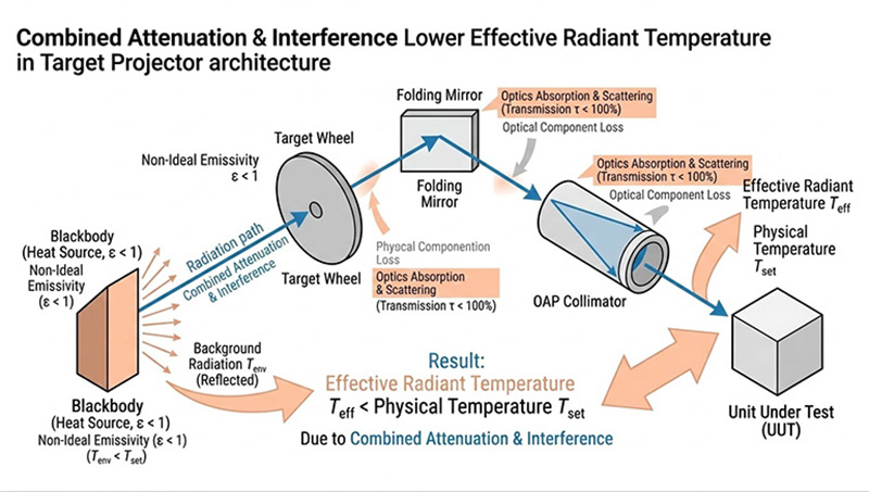 在目標投影器架構中,黑體發出的紅外線輻射必須穿過目標輪、折疊反射鏡、與離軸拋物面準直儀,最終才能抵達待測物(UUT),純粹的光學物理指出,光學元件會吸收與散射部分能量,導致透射率低於百分之百,同時,黑體表面並非絕對的理想黑體(發射率小於一),這使得它會反射周遭環境的背景輻射。