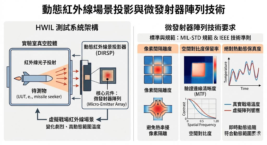 在 HWIL 測試中,動態紅外線場景投影器(DIRSP)負責在實驗室的真空中,向待測物投射出變化劇烈、具備高動態範圍溫度的虛擬戰場,負責產生這些紅外線光子的核心元件,是一塊佈滿百萬個微型加熱器的半導體晶片——「微發射器陣列(Micro-Emitter Array)」,國際軍規標準如 MIL-STD 規範,以及 IEEE 針對先進導引武器硬體迴路模擬的最新準則,皆對這塊微小陣列的「空間對比度保留率」、「像素間隔離度」與「絕對熱動態保真度」提出了近乎物理極限的要求。