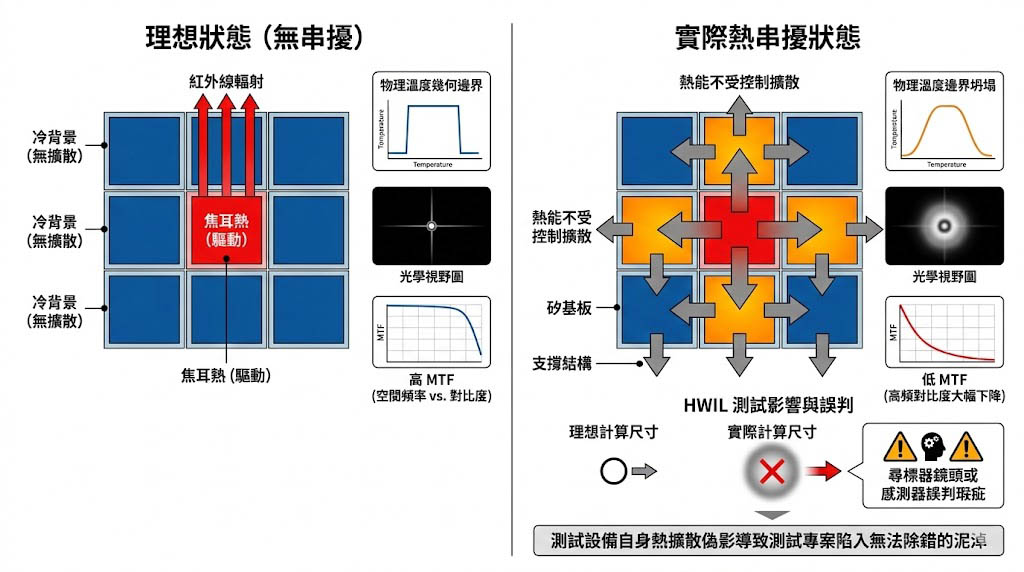 實務上最致命的痛點在於「熱串擾(Thermal Crosstalk)」,當陣列上的一個像素被驅動至攝氏四百度的極端高溫以模擬引擎尾焰時,它所產生的龐大熱能會透過底層的支撐結構與矽基板,無可避免地傳導至相鄰的像素(這些相鄰像素原本可能被設定為代表零下二十度寒冷天空的背景狀態),這種物理洩漏導致原本應該是垂直峭壁般的溫度幾何邊界,坍塌成平緩的熱梯度斜坡; 從光學測試的角度來看,熱串擾直接摧毀了投影系統在高空間頻率下的調變轉換函數(MTF),當工程師試圖在 HWIL 迴路中測試尋標器的空間解析度極限時,熱串擾會讓微小的點目標或銳利的幾何邊緣變得模糊不清,演算法最終計算出的目標尺寸會比實際設定更大,且對比度大幅下降。這種由測試設備自身熱擴散造成的偽影,會讓工程師誤判尋標器的光學鏡頭或感測器存在瑕疵,導致耗資巨大的測試專案陷入無法除錯的泥淖。
