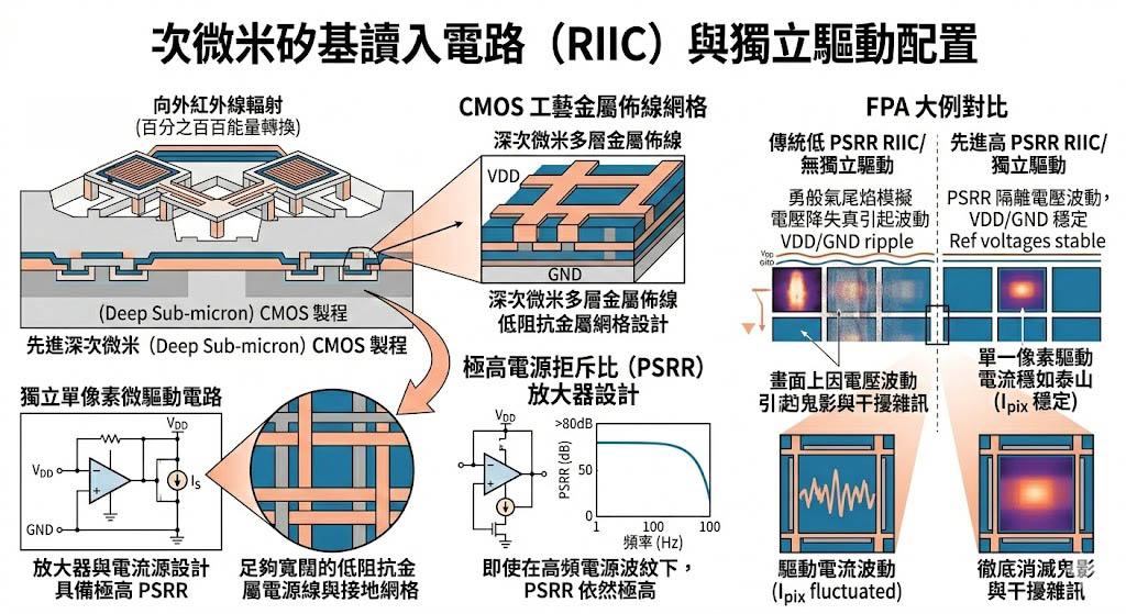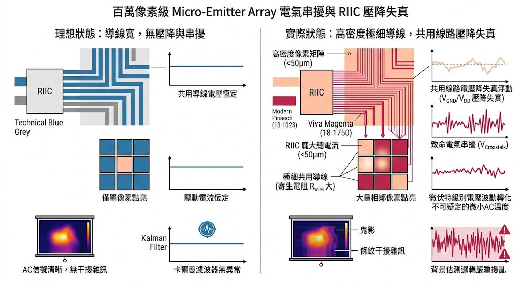 如果說熱能擴散是空間上的災難,那麼「電氣干擾(Electrical Crosstalk)」則是訊號傳輸上的噩夢,為了在極短的時間內(例如數毫秒)將百萬個像素推升至高溫,陣列底層的「讀入積體電路(Read-In Integrated Circuit, RIIC)」必須瞬間輸送極其龐大的總電流。