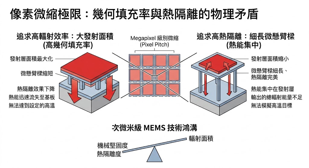 這裡存在著一個無法迴避的機械結構與熱力學矛盾:為了最大化紅外線輻射的輸出效率,像素表面的「發射面積」必須盡可能大(即追求高幾何填充率);但為了防止熱能流失到基板並減少前面提到的熱串擾,像素發射面與底層電路之間必須透過極度細長的「微懸臂樑」結構懸空架起,以實現完美的「熱隔離(Thermal Isolation)」,當像素尺寸微縮時,工程師沒有足夠的空間來建造足夠長且細的懸臂樑;如果為了維持發射面積而縮短懸臂樑,熱隔離效果就會大幅下降,導致熱能瞬間被基板吸走,像素無法達到設定的極端高溫;如果為了維持熱隔離而縮小發射面積,則像素輸出的總輻射能量會嚴重不足,無法滿足模擬高溫目標的需求,要在次微米級別的微機電系統(MEMS)製程中,於「機械堅固度」、「熱隔離度」與「輻射面積」這三者之間找到完美的平衡,是當今半導體與光電產業界最難以跨越的技術鴻溝。