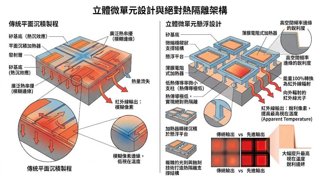 為了解決熱串擾與像素微縮的矛盾,先進陣列必須放棄傳統的平面沉積製程,改採「立體微單元(Unit Cell)懸浮設計」,其核心配置邏輯在於,利用極度複雜的光刻與蝕刻技術,在矽基底上打造出如微縮橋樑般的熱隔離支撐結構,將薄膜電阻式加熱器(Thin-film Resistive Heaters)精確沉積於這些懸浮的平台上,這種設計確保了發射面與產生熱沉效應的基板之間,僅透過熱傳導率極低的微小支柱連接。透過這種近乎完美的物理隔絕,不僅能將熱串擾控制在絕對的最小範圍內,確保高空間頻率邊緣的銳利度,更能讓加熱器產生的能量百分之百轉換為向外輻射的紅外線光子,大幅提升像素的最高視在溫度(Apparent Temperature)。