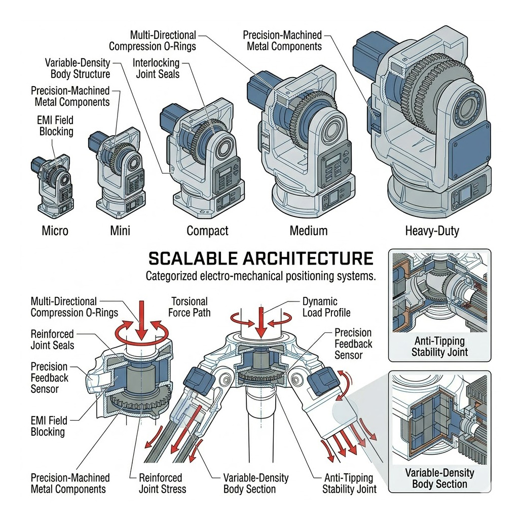 這種非線性的力學放大,會直接對雲台的俯仰軸(Tilt Axis)產生災難性的破壞,如果勉強使用輕型架構來驅動重載,傳動齒輪箱的受力面將遠超其材料的屈服強度(Yield Strength),導致急停時發生崩齒;反之如果一味追求「重載通用」,使用重型鑄造機殼與超大扭矩減速機來搭載僅有 5 公斤的光學鏡頭,不僅造成無謂的成本浪費,其過大的系統自重與摩擦阻力更會使得微幅循跡追蹤(Micro-tracking)變得遲鈍且充滿低頻震盪。這正是為何機電平台必須依據「輕載、中載、超重載」進行嚴格物理分級的首要原因。