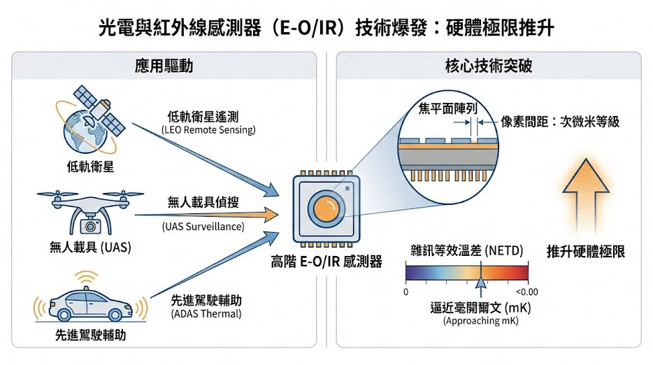 進入 2026 年,隨著低軌衛星遙測載荷、無人載具(UAS)多光譜偵搜系統以及先進駕駛輔助系統(ADAS)的高階熱成像技術爆發,光電與紅外線感測器(E-O/IR)的硬體極限已被推升至前所未有的境界;現代焦平面陣列(FPA)的像素間距持續微縮至次微米等級,且熱靈敏度指標如雜訊等效溫差(NETD)已逼近毫開爾文(mK)的極端領域。
