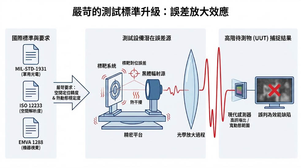 在這樣的技術背景下,國際測試標準與法規面臨了全面的升級,例如:針對軍用光電系統介面與測試的 MIL-STD-1931 標準、評估空間解析度的 ISO 12233 標準,以及針對機器視覺感測器的 EMVA 1288 規範,皆對測試設備的「空間定位精度」與「熱動態穩定度」提出了極度嚴苛的要求,測試規範之所以越來越嚴格,是因為現代感測器的訊號雜訊比極高,且具備極寬廣的動態範圍,任何來自測試設備本身的機械微震動、標靶對位誤差,或是標靶板與黑體輻射源之間的熱干擾,都會在光學放大的過程中被劇烈放大,並被待測物(UUT)捕捉為效能缺陷。