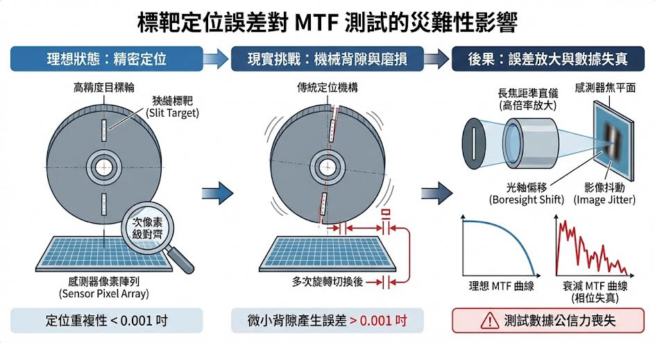 如果目標輪的旋轉定位機構採用傳統的直接驅動或缺乏高精度制動設計,在經過多次旋轉切換後,往往會產生微小的機械背隙與磨損,業界對於高階標靶定位系統的極限要求是,孔位至孔位的定位重複性必須小於千分之一英吋(小於 0.001 吋),一旦大於這個誤差值,搭配長焦距準直儀的高倍率放大後,標靶邊緣在感測器焦平面上成像的相位將發生嚴重的光軸偏移(Boresight Shift)與影像抖動。