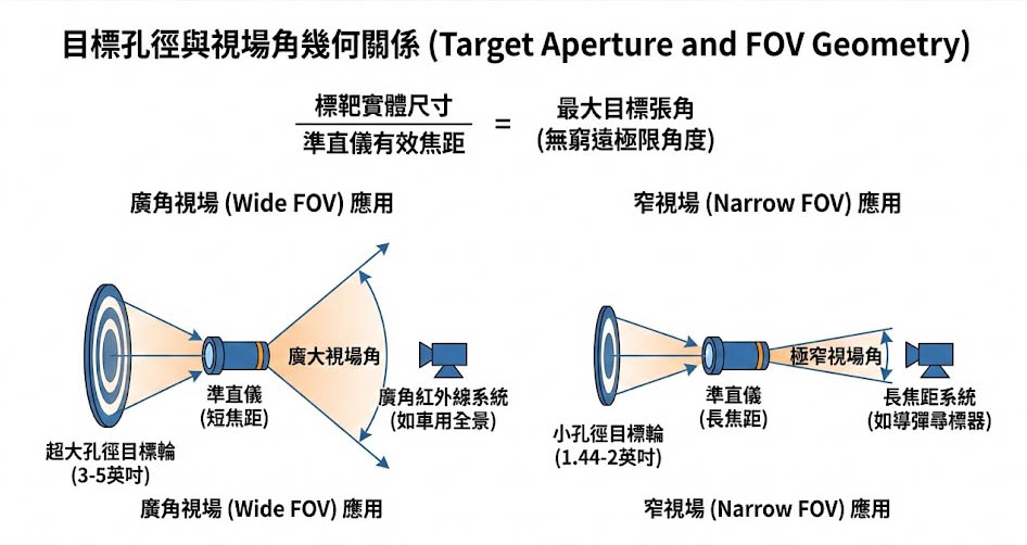 目標孔徑決定了標靶的實體物理尺寸,選擇多大的標靶,取決於待測物的視場角(FOV)以及所搭配的準直儀焦距,我們可以用純粹的幾何敘述來理解這個光學觀念:在準直儀的焦平面上,標靶的實體尺寸除以準直儀的有效焦距,即等於該標靶在無窮遠處所投射出的極限角度(即最大目標張角)。