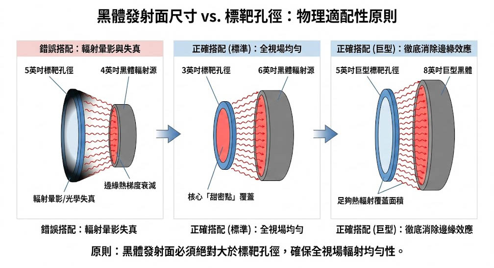 • 針對 5 英吋巨型孔徑 的目標輪,必須強迫搭配高達 8 英吋(8" x 8")甚至 12 英吋巨型黑體,以提供足夠的熱輻射覆蓋面積,徹底消除邊緣熱衰減效應。