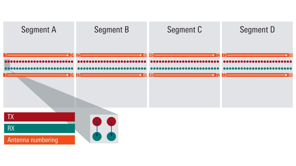 R&S®QAT-B11 標準前端配備 96 個發射天線和 5 個接收天線,分為 4 個獨立區段,此配置滿足了 SIMO 感測器要求,R&S®QAT100 可依需求以線路模式或分段模式運作,分段模式將每條線路分為四個段,每個段配備獨立的射頻連接器,可模擬來自不同方向的最多四個目標;R&S®QAT-B11 可配備額外的 TX/RX 線路 (R&S®QAT-B2),以增加另外 96 根發射天線和 5 根接收天線,從而模擬來自不同方向的最多 8 個目標或整個陣列中的兩個物體。