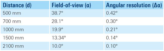 FOV 和角度解析度的值由不同的距離決定,根據距離和頻率範圍,適用以下值: