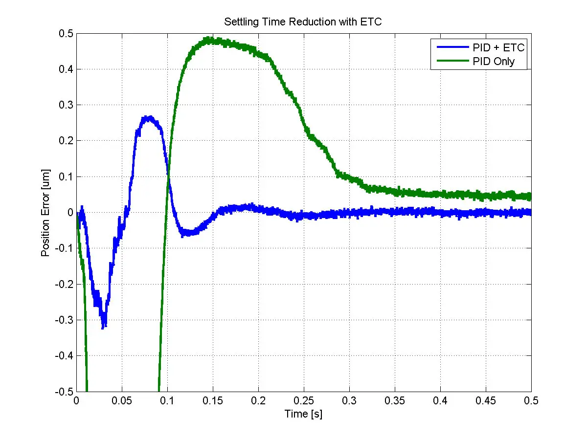 增強型追蹤控制演算法透過消除與次微米公差相關的長整定時間尾端,顯著改善了點對點定位的性能(如圖 2 所示),採用滾動元件軸承的系統,在滾動元件接近但尚未完全到達最終位置的準靜態狀態下,通常需要很長的整定時間,啟用 ETC 演算法後,伺服系統在低頻下具備更高的迴路增益,能提供額外的驅動力來克服軸承摩擦力的阻礙。