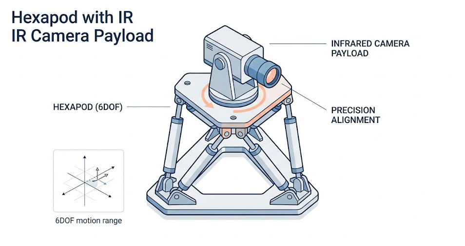 Aerotech Hexapods 系統採用了極度精密的無背隙傳動機構與超高解析度的絕對位置編碼器,這種實驗室等級的設計,徹底消除了傳統平台在關節處產生的微小游隙,當系統執行複雜的空間旋轉與平移矩陣時,能確保幾何旋轉中心 (Center of Rotation) 具備絕對的空間鎖定能力,將阿貝誤差的放大效應降至物理極限,這為高解析度紅外線攝影機、航空衛星感測器以及半導體雷射校準,提供了無懈可擊的空間基準,確保每一次的微弧度視距偏移,皆是待測物真實的效能反映,而非測試機台的干擾。