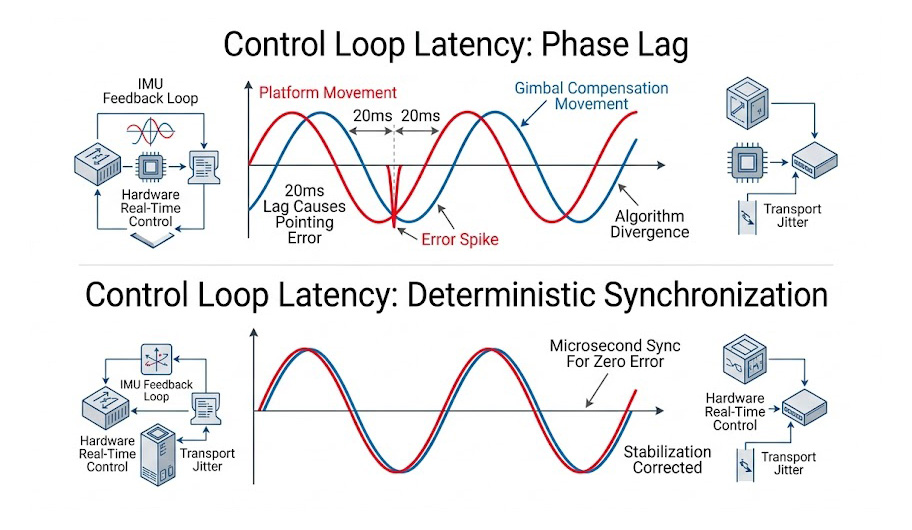 假設測試指令要求平台以 10 度/秒 的角速度抬升,但因為通訊延遲,平台慢了 15 毫秒才開始動作,此時光學測試儀器已經開始記錄影像偏差,而光電系統的 IMU 卻還沒感受到物理晃動,這種「控制指令」與「物理實體」之間的時序脫節與相位落後(Phase Lag),會讓工程師測得巨大的視距誤差。研發團隊將陷入極度的困擾:根本無法釐清這巨大的誤差,是因為光電雲台自身的控制演算法寫得太差,還是因為測試機台的底層延遲所引發的偽性失真。