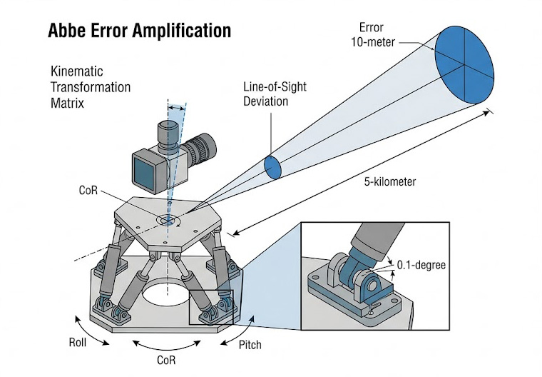 根據阿貝誤差(Abbe Error)原理,平台底部一個僅僅 0.05 度的微小角度偏差,經過幾何投影放大後,在距離光學感測器五公里遠的虛擬標靶上,將產生高達數公尺的瞄準位移,若測試平台不具備次微米級的絕對定位精度與無背隙的傳動機構,其自身產生的運動學耦合誤差,將遠遠大於待測光電系統的殘餘誤差,使得所有針對次弧秒(Sub-arcsecond)級別的高階追蹤演算法驗證失去科學意義。