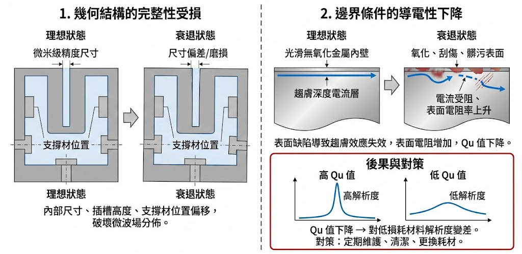 微波電流在腔體金屬內壁流動,其深度僅為「趨膚深度 (Skin Depth)」,隨著頻率升高(如毫米波頻段),電流流動層極薄。任何表面的氧化、刮傷或髒污,都會導致表面電阻率上升,直接造成 空腔品質因子 (Qu) 下降。