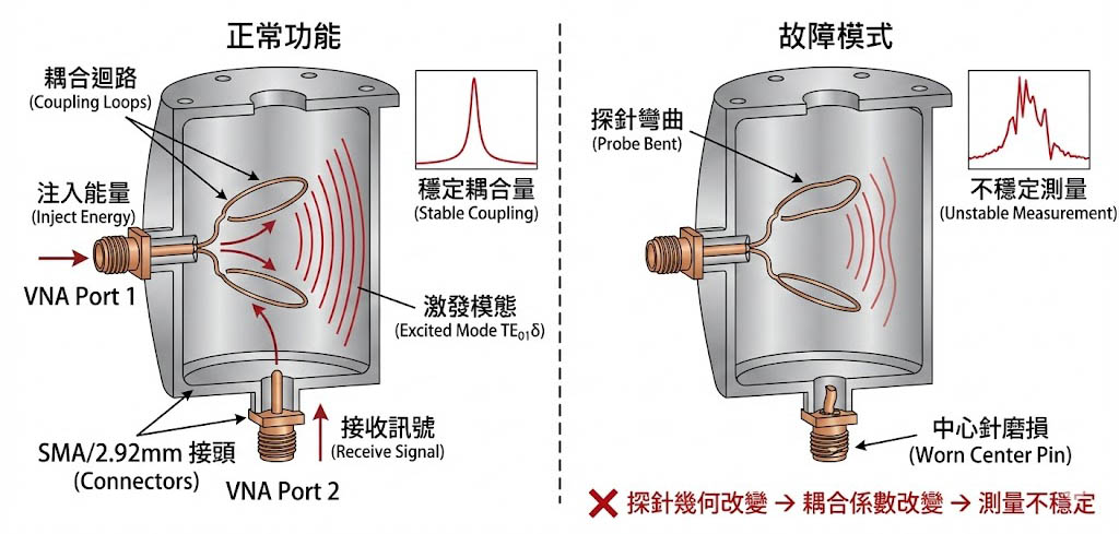 - 故障模式:為了調整耦合量 (S21 峰值大小),探針通常是可移動或可旋轉的,長期的插拔、旋轉調節或不慎碰撞,會導致探針彎曲、斷裂或連接器(SMA/2.92mm 接頭)中心針磨損,一旦探針幾何形狀改變,耦合係數就會改變,導致測量不穩定。
