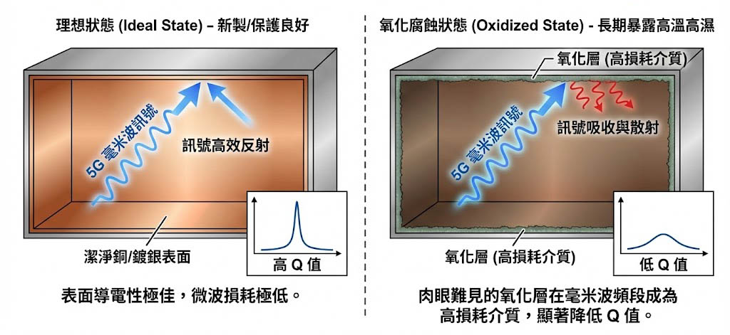 - 故障模式:氧化與腐蝕,銅或鍍銀的表面在長期暴露於空氣中(特別是高溫高濕環境下)會產生氧化層,雖然肉眼看不太出來,但在 5G 毫米波頻段下,這層氧化物就是高損耗介質,會顯著降低 Q 值。