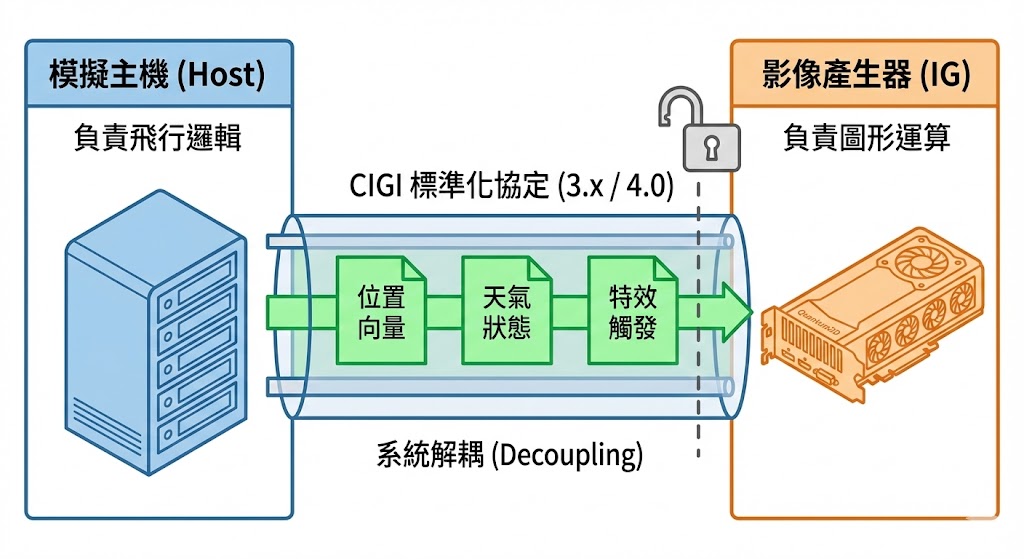 CIGI 標準化協定:本圖解闡述了現代化模擬器如何透過 CIGI (Common Image Generator Interface) 協定解決舊式系統硬體綁定的問題。