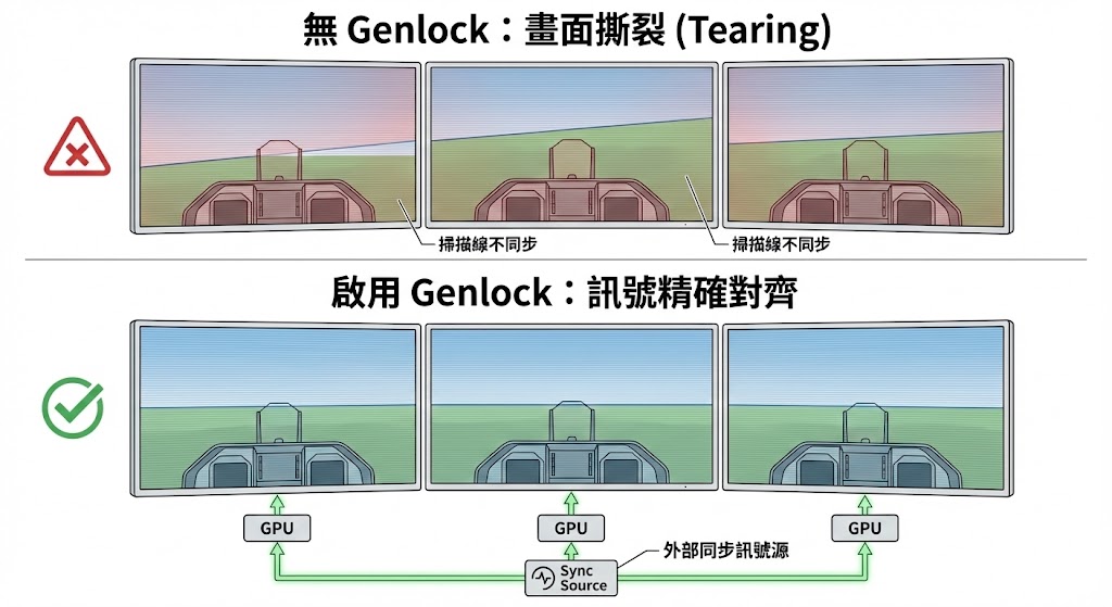 高階模擬器通常擁有多個視窗通道(Channels),涵蓋 180 度甚至 360 度的視野,新一代的 PC 架構 IG 必須利用 Genlock(Generator Lock)技術,強制所有 GPU 的訊號掃描線與外部同步訊號源(Sync Source)對齊,若缺乏此技術,高速轉向時不同螢幕間會出現畫面撕裂(Tearing)或不同步,導致飛行員產生空間迷向。