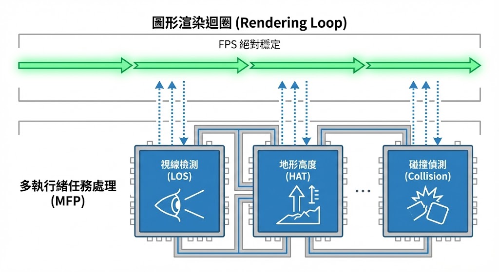 現代 IG 軟體不再只是繪圖引擎,它還需分擔部分運算任務,透過多執行緒任務功能處理(MFP),系統利用多核心 CPU 處理視線檢測(Line-of-Sight, LOS)、地形高度查詢(Height-Above-Terrain, HAT)以及碰撞偵測,這些計算在背景執行,不佔用渲染迴圈的時間,確保畫面幀率(FPS)的絕對穩定,這對於軍事級訓練至關重要。