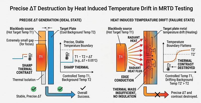 MRTD 測試的核心在於產生極其微小且精確的溫差(通常小於百分之五攝氏度),這要求黑體(模擬目標溫度)與目標板(模擬背景溫度)之間具備絕對的熱隔離,實務上的物理難點在於,當黑體與目標板極度靠近以確保光學對焦時,黑體的輻射熱能會不可避免地烘烤目標板的金屬結構,若目標板與目標輪的熱質量(Thermal Mass)不足或缺乏有效的隔熱設計,目標板的溫度會逐漸漂移,導致系統設定的微小溫差(ΔT)被破壞;此外,熱能沿著金屬圖案邊緣傳導,會使原本銳利的幾何溫度邊界變得平緩,從而摧毀測試圖案的熱對比度。