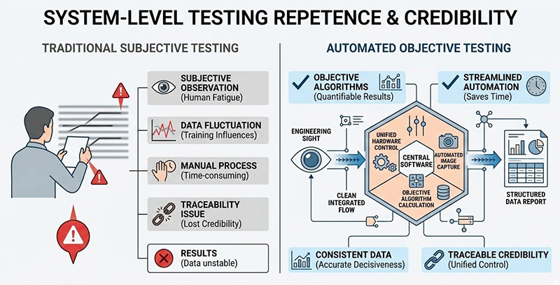 系統級測試是一個涉及多維度變數的過程,以完整的 MRTD 測試為例,工程師需要改變空間頻率(旋轉目標輪)、改變溫差極性與大小(控制黑體)、並分析影像品質(擷取影像),若系統中的準直儀、目標輪與黑體來自不同廠商且未經軟體整合,操作人員必須手動協調這些設備的運作;手動切換目標輪極易引入微小的機械震動,破壞無窮遠焦點;等待黑體達到熱平衡的過程若無數位監控,則容易過早或過晚擷取數據,這種非閉迴路的操作模式,不僅測試週期極長,更因包含大量人為介入,導致數據缺乏跨批次的重複性與公信力。