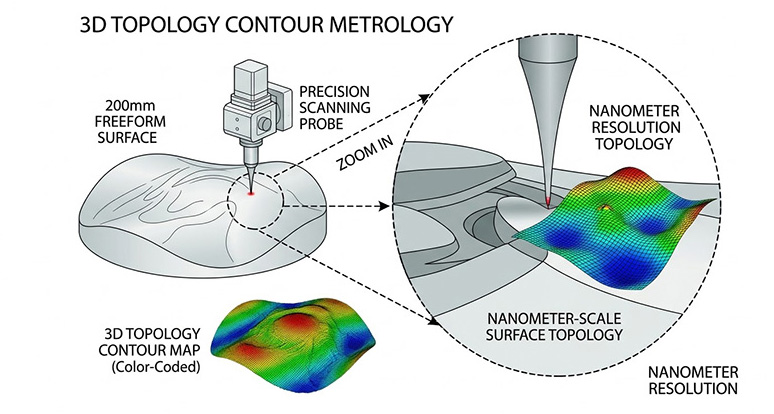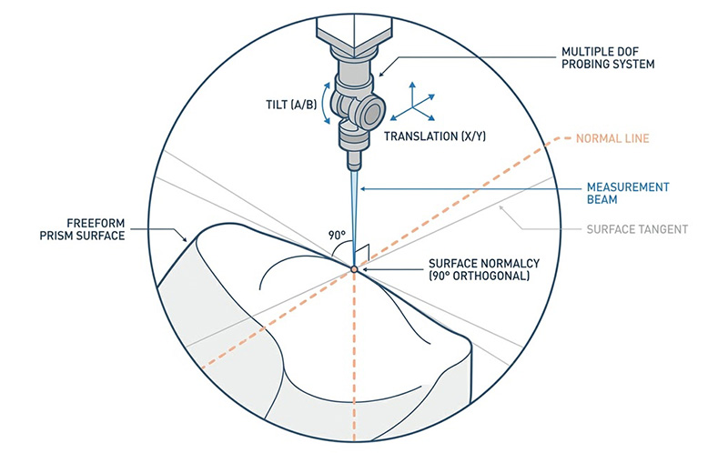 對於完全沒有旋轉對稱性的自由曲面(如擴增實境眼鏡的自由曲面稜鏡),量測探頭必須能夠在多個維度上自由移動與傾斜,以確保探頭的量測光束始終與鏡片表面保持完美的法線(Normalcy)正交角度,這通常需要一個由多個線性軸(徑向與垂直軸)與旋轉軸(探頭傾斜軸)組合而成的多自由度運動學平台。