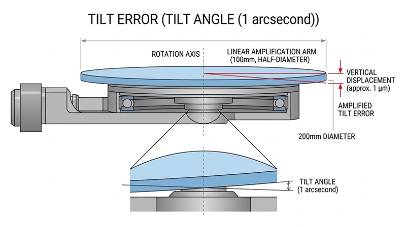 更致命的是「傾斜誤差(Tilt Error)」,當旋轉台在迴轉時發生微小的角偏擺,這個微小的角秒級誤差會隨著待測物直徑的增加而被力臂線性放大,以直徑兩百毫米的鏡片邊緣為例,旋轉台只要產生一角秒(約等於四點八微徑度)的傾斜誤差,就會在鏡片邊緣產生接近一微米的垂直高度位移;因此如何打造出具備「零摩擦」、「零機械遲滯」,且軸向與徑向誤差低於一百奈米、傾斜誤差低於零點五角秒的終極旋轉機構,是突破光學量測極限的首要挑戰。