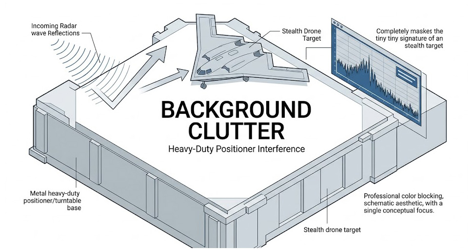 雖然現代儀器具備硬體時間閘門(Time-Domain Gating)技術,可藉由設定時間視窗來濾除目標距離之外的反射,但轉台與目標在空間距離上極度接近,傳統的時間濾波往往無法乾淨地將轉台的雜訊從目標回波中剝離,如果轉台本身的散射截面積大於隱身待測物的截面積,所測得的 RCS 數值將是轉台的反射,而非目標物的真實性能。