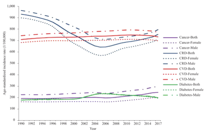 圖 4:1990 年至 2017 年間中國主要非傳染性疾病 (NCDs) 的趨勢圖,這些 NCDs 包括癌症、慢性呼吸道疾病 (CRD)、心血管疾病 (CVD) 和糖尿病,這些比率在 2000 年代初期曾呈下降趨勢,但近期趨勢指向上升;圖片來源:中國疾病預防控制中心週報 [6]