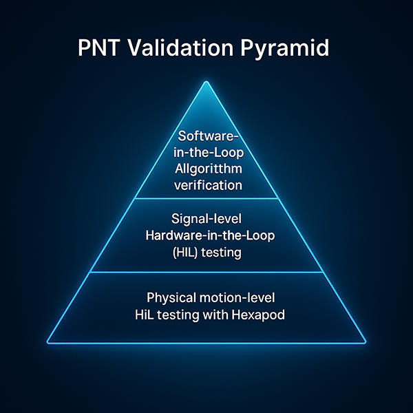 PNT系統的極限考驗,其終極目標是確保在任何可預見的,乃至部分不可預見的極端條件下,自主系統都能獲得持續、準確、高完整性的時空參照,從純粹的軟體迴路(SIL)演算法驗證,到引入真實硬體的訊號級硬體迴路(HIL)測試,再到結合六軸運動平台(Hexapod)的物理運動級HIL測試,構成了一個由虛向實、逐步逼近真實操作環境的完整PNT驗證金字塔。
