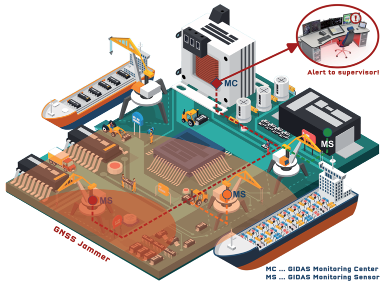 GIDAS Stationary 固定式監測系統在港口或沿岸等海事關鍵區域的部署示意,突顯 GNSS 訊號完整性對海運基礎設施的重要性。