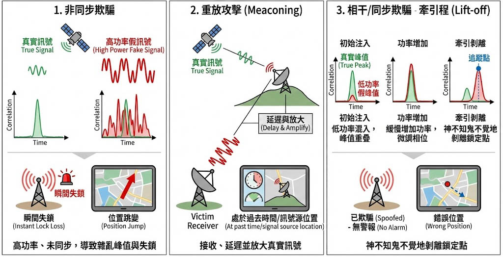 這是最致命的「智慧型攻擊」。攻擊者精確計算目標接收機的位置與速度,產生與真實訊號頻率、相位、碼延遲完全一致的假訊號;牽引過程(Lift-off為攻擊訊號最初以低功率混入,與真實訊號的相關峰值重疊,接著攻擊者緩慢增加功率並微調相位,神不知鬼不覺地「剝離」接收機的鎖定點,將其拖向錯誤的位置,這種過程不會觸發失鎖警報,極難防禦。