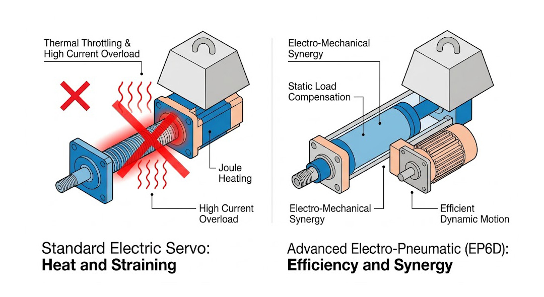 SANLAB 突破性地在這些重型型號上採用了電-氣動混合平衡技術(Electro-Pneumatic, 標示為 EP6D),其致動器內部不僅有精密的滾珠螺桿與高扭力 AC 伺服馬達,更內建了強大的輔助氣壓缸。由氣壓缸承擔高達 14,000 公斤的靜態設備重量,讓伺服馬達徹底從對抗地心引力的泥沼中解放出來,專職負責「動態瞬態加速度」的輸出。這項技術不僅消除了馬達的熱負荷,延長了設備的壽命,更賦予了巨型平台不可思議的敏捷推背感。