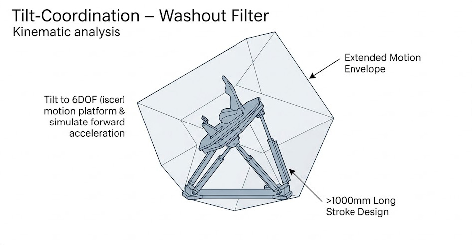 洗出演算法的核心技巧之一是「傾斜協調(Tilt-Coordination)」,當需要模擬持續向前的加速感時,平台會偷偷向後傾斜,利用重力的分量將駕駛員壓在椅背上;只要視覺系統(螢幕)保持水平,大腦就會產生「正在加速」的錯覺,然而這種幾何欺騙需要龐大的「運動包絡(Motion Envelope)」作為支撐,當平台承載巨大負載進行俯仰(Pitch)或滾轉(Roll)時,六支致動器會在多軸耦合狀態下互相拉扯。如果致動器的物理行程(Stroke)過短,平台在傾斜到一半時就會無情地撞擊到軟體或硬體的極限邊界(Soft/Hard Limits),為了防止機械損壞,系統會強制煞車,這種突如其來的反向減速,會瞬間摧毀駕駛員辛苦建立的沉浸感(Immersion),產生強烈的「錯誤提示(False Cueing)」,這在專業的軍事與飛航訓練中是絕對不被允許的致命缺失。