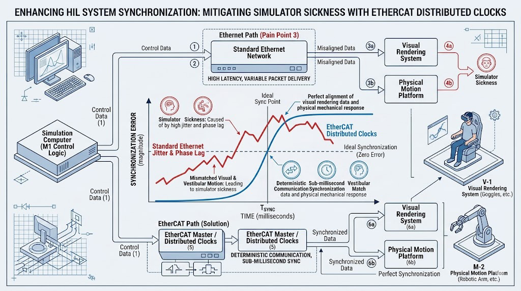 這種「視覺先行,體感滯後」的相位落後(Phase Lag),不僅會在短時間內引發嚴重的模擬器暈動症(Simulator Sickness),更會導致受訓者產生錯誤的肌肉記憶(Muscle Memory)。受訓者會因為感覺不到車輛的即時反饋,而過度操作方向盤或操縱桿,引發飛行員誘發震盪(PIO),要克服這點,巨型機電系統必須能被無縫整合進如 EtherCAT 這類工業級的確定性即時網路中,達成微秒級的時脈同步(Distributed Clocks),確保數位訊號與龐大物理質量的動作能在時間軸上達到完美的絕對對齊。