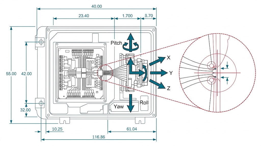 衛星LCT模組的6自由度主動對位與空間封裝,顯示多軸操控與亞微米精密容差。