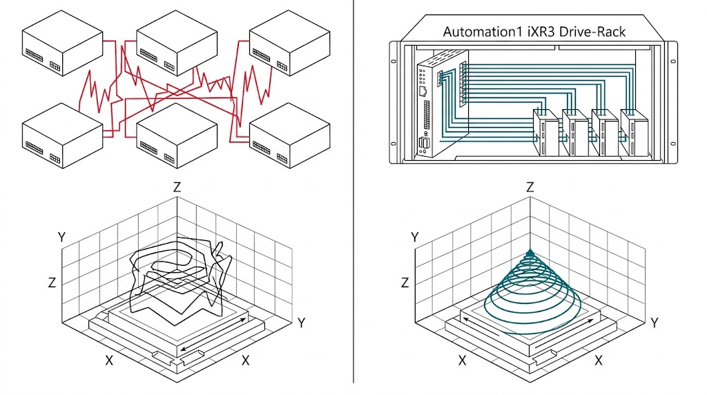 本圖對比運動控制系統。左側分散式控制器連接混亂(紅線),導致下方路徑不規則;右側整合式 Automation1 iXR3 Drive-Rack(藍線)實現了精確的螺旋運動路徑,代表高精度與有序性。