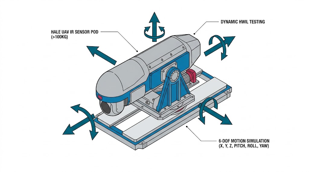 HALE UAV 重量級紅外莢艙動態硬體迴路 (HWIL) 測試,展示完整的六自由度 (6-DOF) 運動模擬功能。