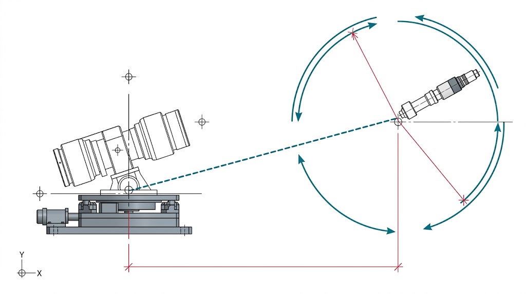 然而這項測試任務隱藏著一個極度致命的幾何學陷阱:「延伸旋轉偏移量(Extended Working Offsets)」,在真實的航太光學測試中,機台並不能只是原地旋轉;為了模擬光束的純粹偏折,巨型莢艙必須繞著一個「虛擬的空間點」進行旋轉,而這個虛擬點(例如雷射發射口或透鏡光心)通常距離承載機台的物理中心超過一公尺以上,要在承載超過一百公斤重物的狀態下,讓設備繞著一公尺外的虛擬點進行完美的 6-DOF 圓滑旋轉,這對傳統機構與運算架構而言,是一場徹底的物理學與控制學災難,本文將深入解密這項航太測試工程中的三大技術天險,並提出國防級的系統整合解決方案。
