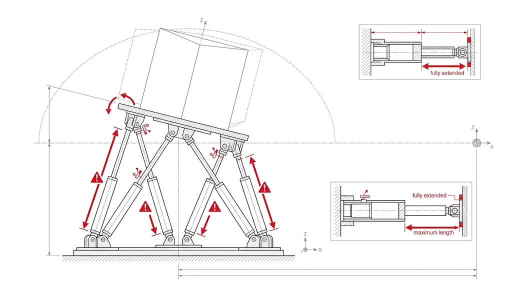 這張運動學分析圖展示了單一 Hexapod 平台執行大幅度旋轉時的極限,紅色警告標誌 (⚠️) 和細節插圖標記 (「完全伸展」 / 「最大行程」) 具體指出,機器人所有伸缩腿已達到物理耗盡點。